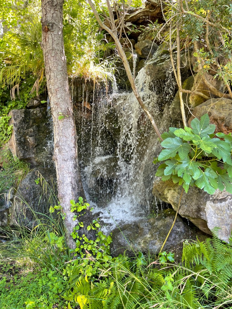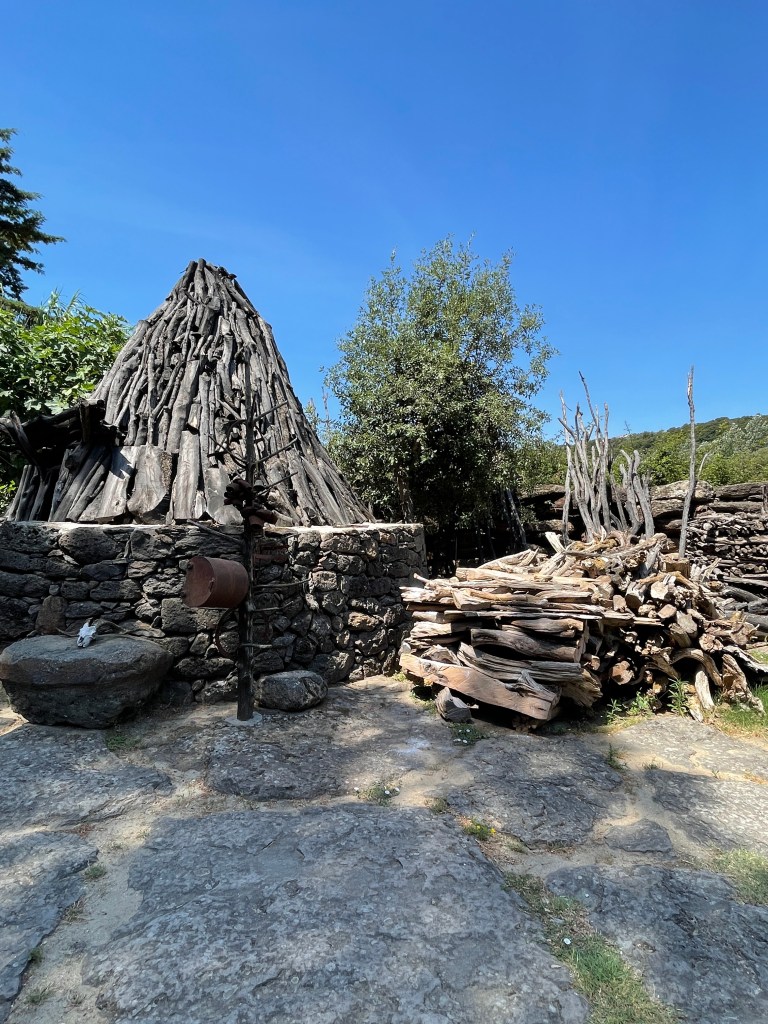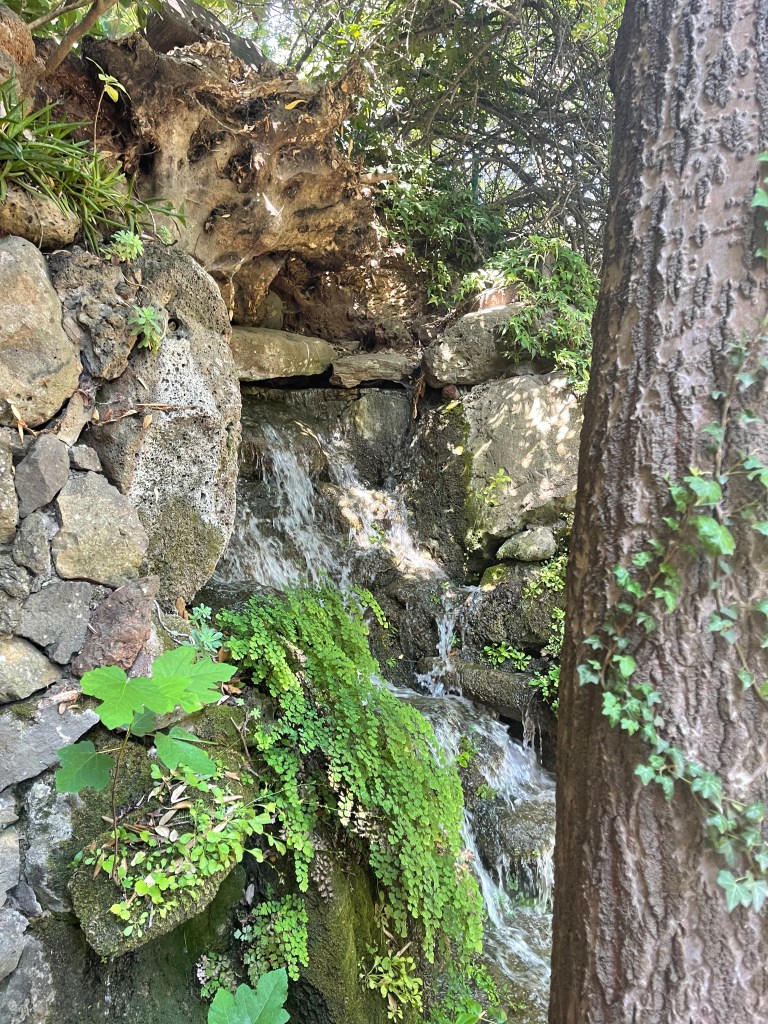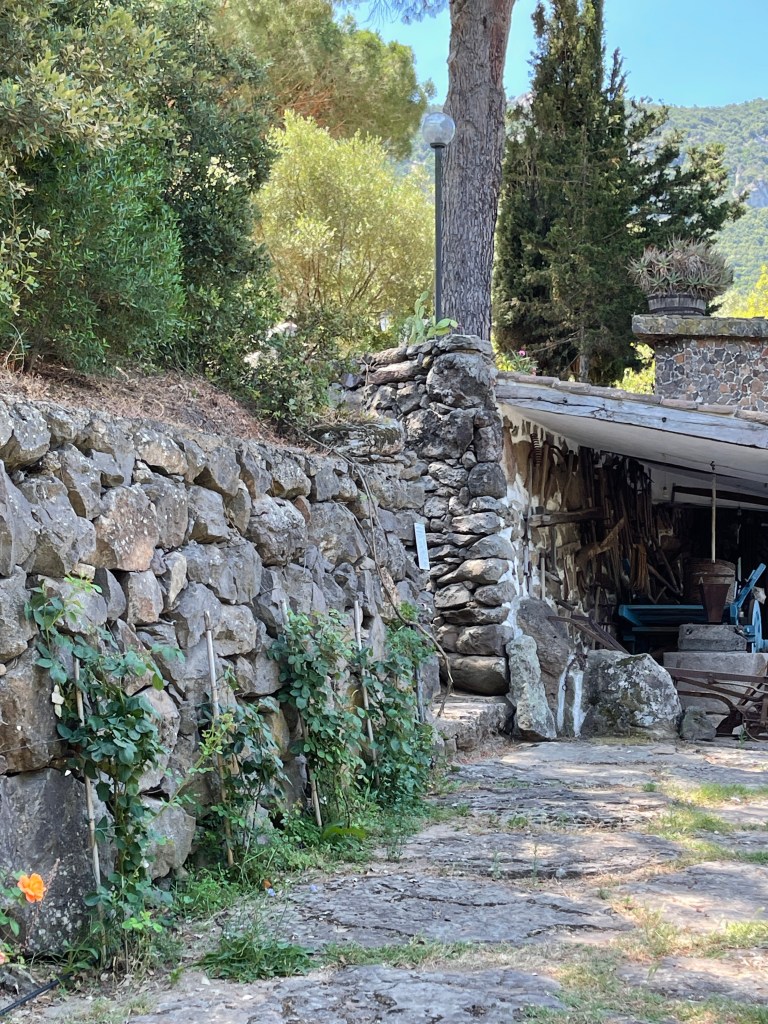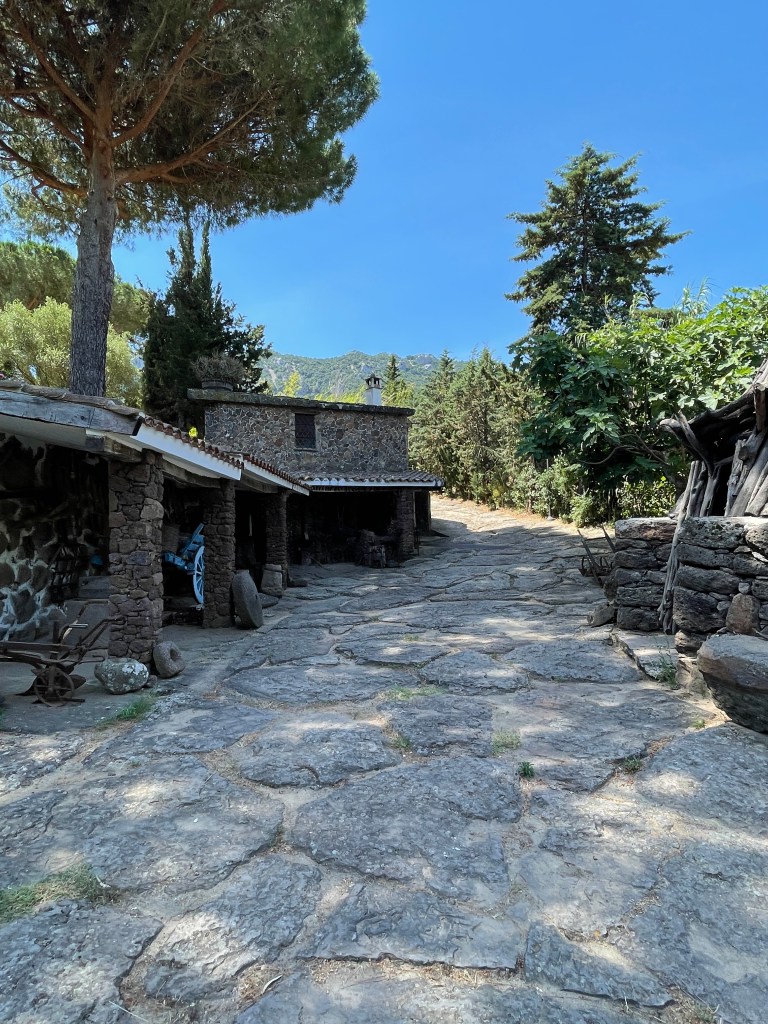 My first visit was to S’Abba Frisca. S’Abba Frisca is a family-owned farm that has been made into a living outdoor museum in Littu Valley in the Nuoro province. It is in the territory of Dorgali, 5 km from the town center and 4 km from Cala Gonone where I was staying. The farm lies beneath the limestone peaks of Mount Ruiu and Mount Irveri. S’Abba Frisca means fresh water, and it gets its name from the spring which feeds into the fountains, a small lake, and waterfalls. The farm paths are made of stone and shaded by a thick grove of evergreen oaks, citrus trees, and other ancient trees that provide shade and keep the air cool even in the scorching summer heat. The sun was beating down without a cloud in the sky so I was thankful to walk in the shade beneath the trees!